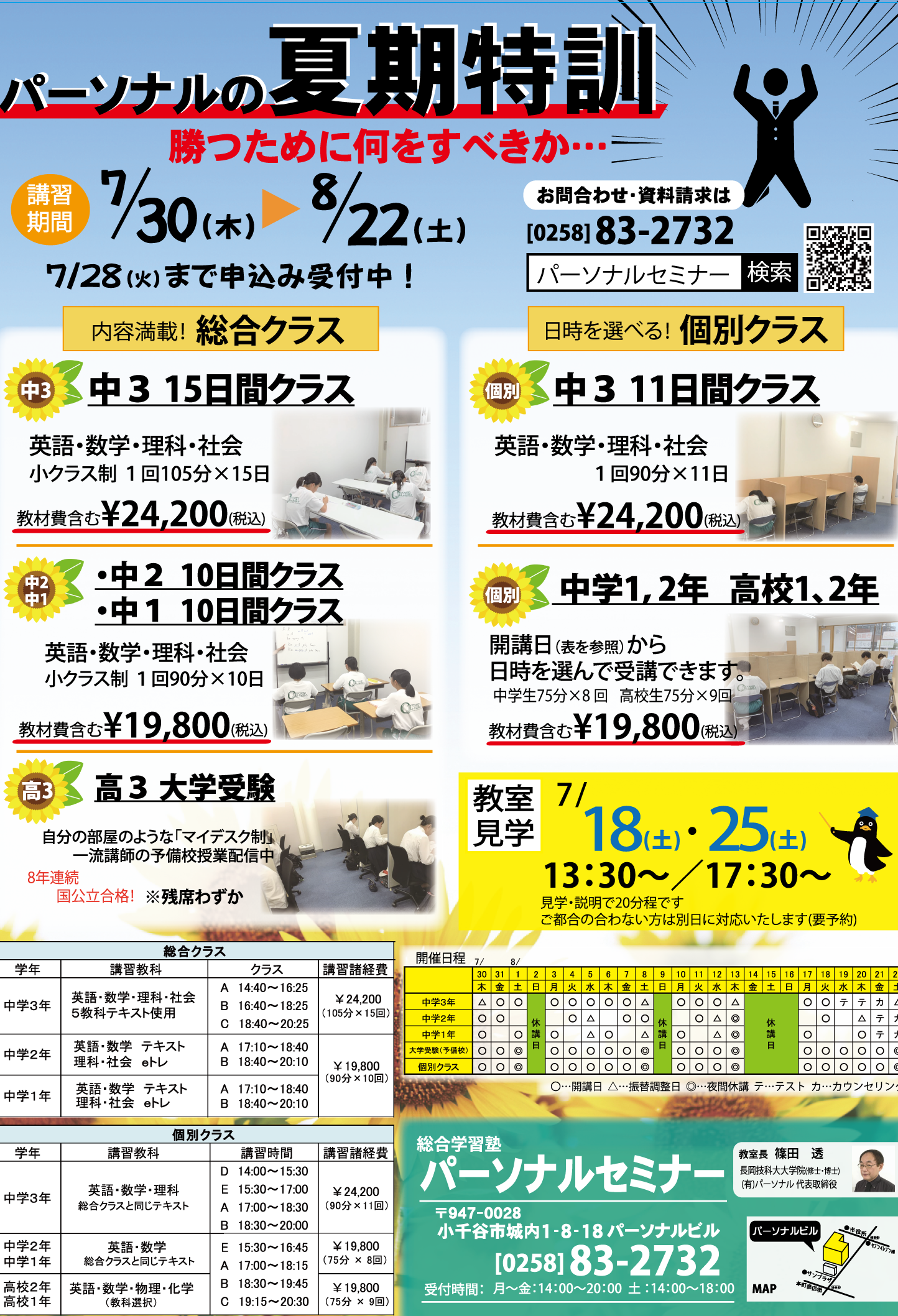パーソナルの夏期講習は7月30日〜8月22日のとなります。内部生には案内をお渡ししておりますが、今月17日頃新聞折り込みにてチラシを配布予定です。