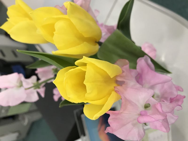 因みにですが…皆さんの気持ちが少しでも紛れれば…と、春のお花を飾っています。お花屋さんおすすめのビタミンカラーのチューリップはとてもかわいいです。
